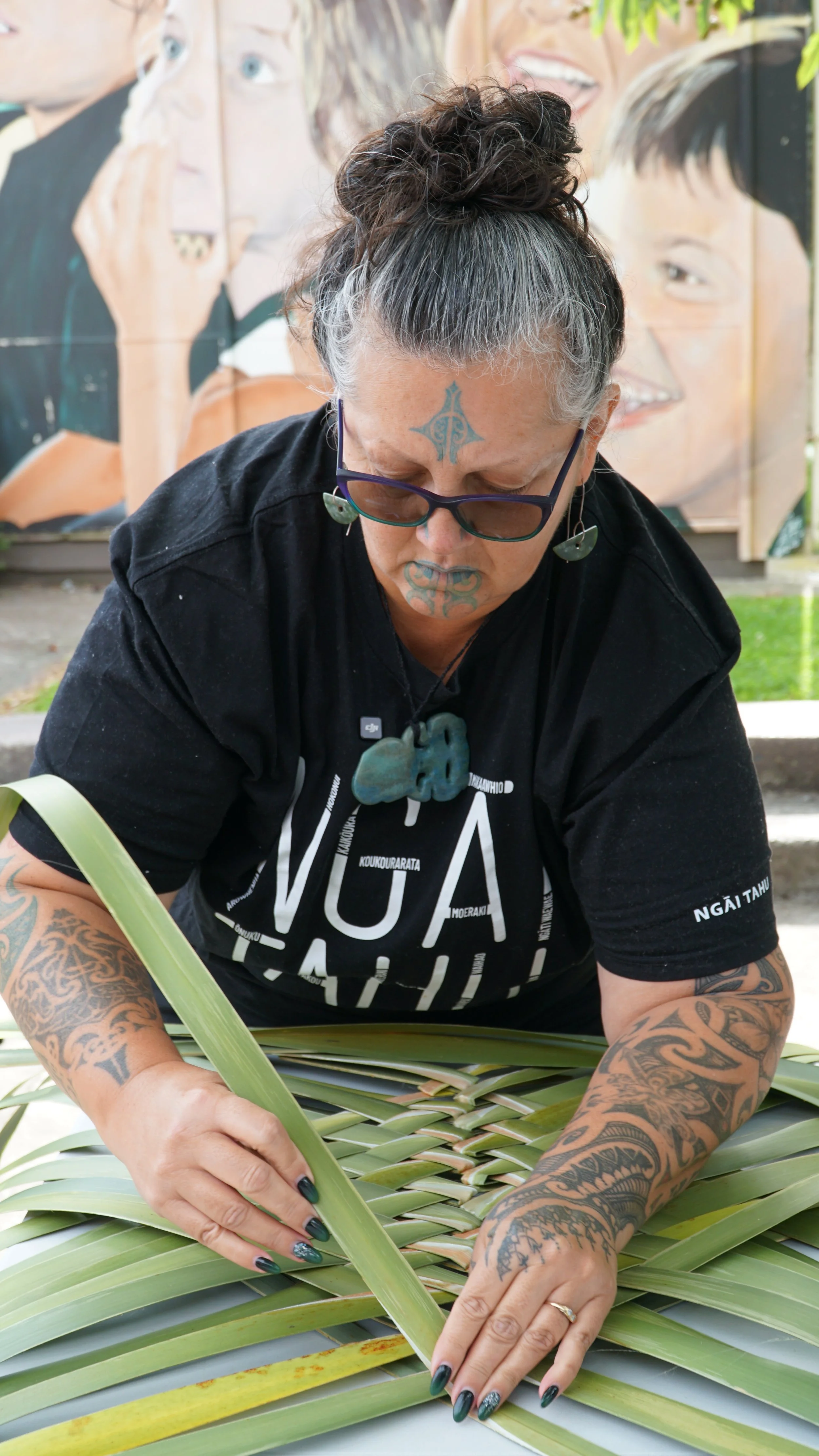 Weaver Missy Campbell (Poutini Kāi Tahu, Ngāruahine, Scottish) says she came to tautoko the kaupapa and share the waikawa style, for a quick and easy single-use whariki.